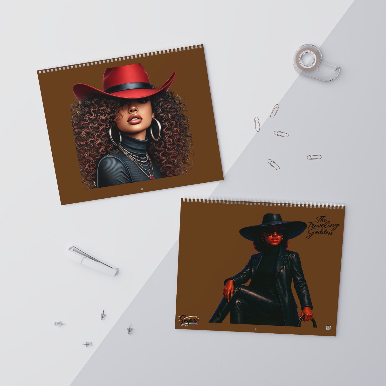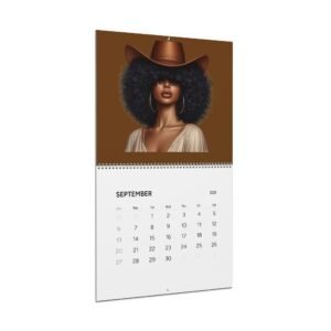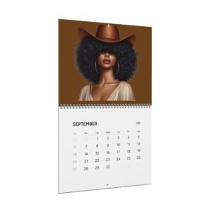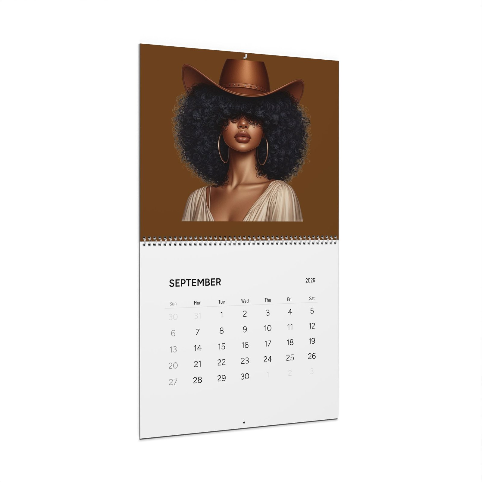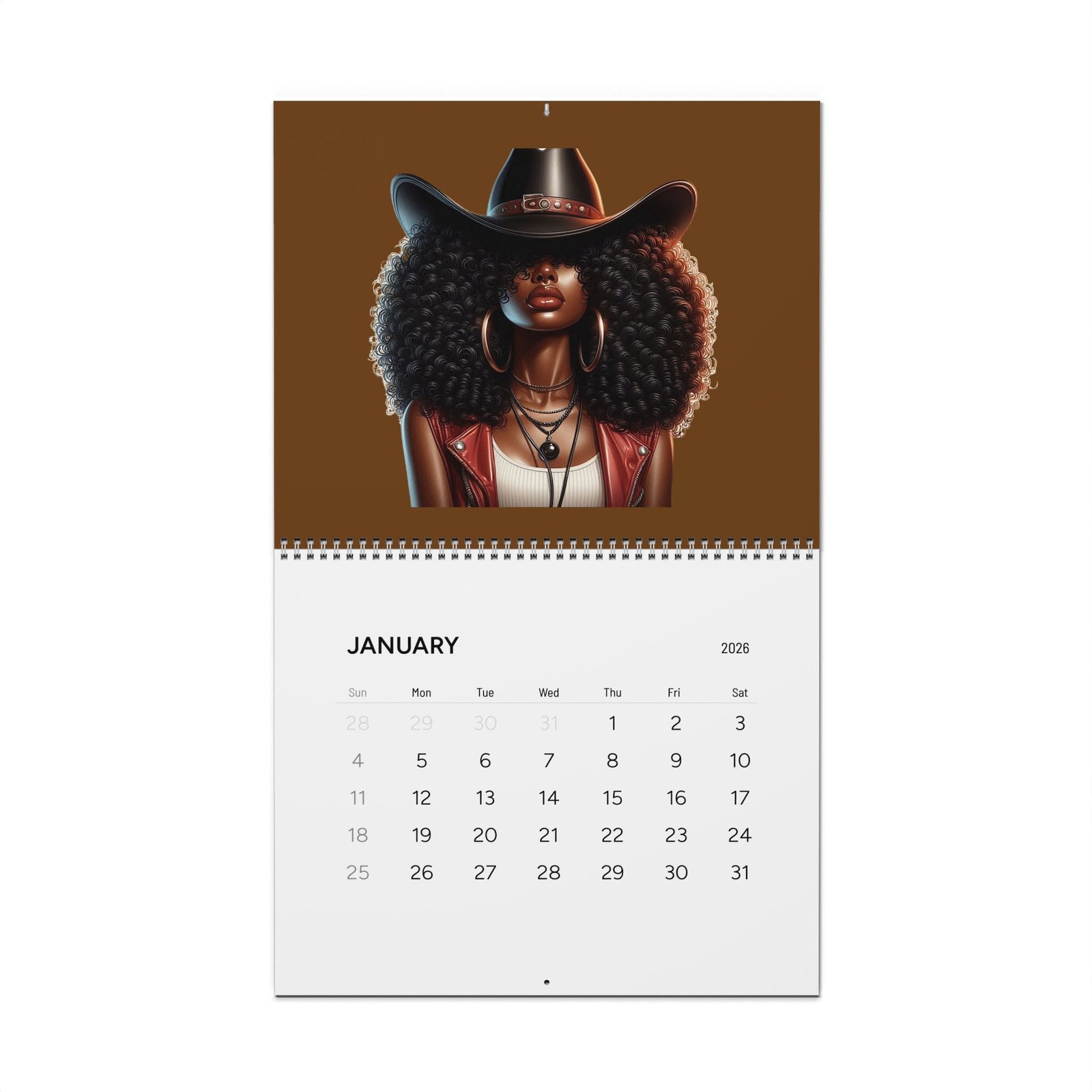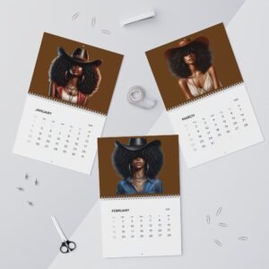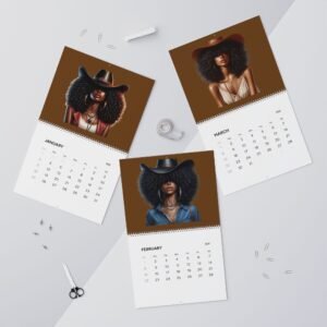 A 2026 wall calendar featuring large, vibrant portrait art celebrating bold, modern cowgirl style. Each month showcases a striking, richly colored illustration with plenty of negative space above a writable matte month-grid. The design balances gallery-quality imagery with practical functionality — thick, premium paper, sturdy spiral binding, and a centered hanging hole make it easy to display and flip through. Available in two sizes and printed with crisp, lasting color, this calendar keeps your year organized while doubling as a rotating wall gallery.