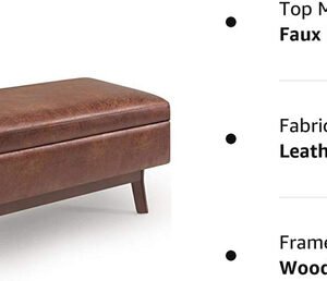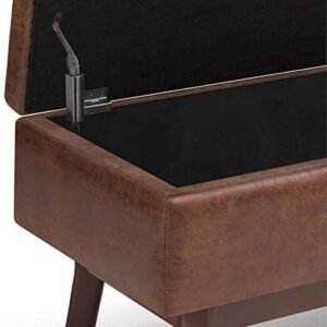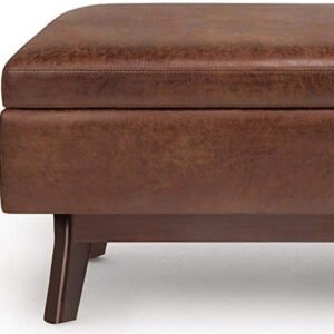 Update your space with the Owen Mid Century Storage Ottoman. Its modern style will add a fresh on trend look to your home. It features a lift up lid and a large interior storage space. Made with solid wood and distressed Faux Air Leather for stylish durability and comfort. Whether used in the living room, family room or den, it will be the showpiece that completes the room. Child safety hinge to prevent lid slamming Simple assembly; just attach legs Efforts are made to reproduce accurate colors, variations in color may occur due to computer monitor and photography At Simpli Home we believe in creating excellent, high quality products made from the finest materials at an affordable price. Every one of our products come with a 1-year warranty and easy returns if you are not satisfied