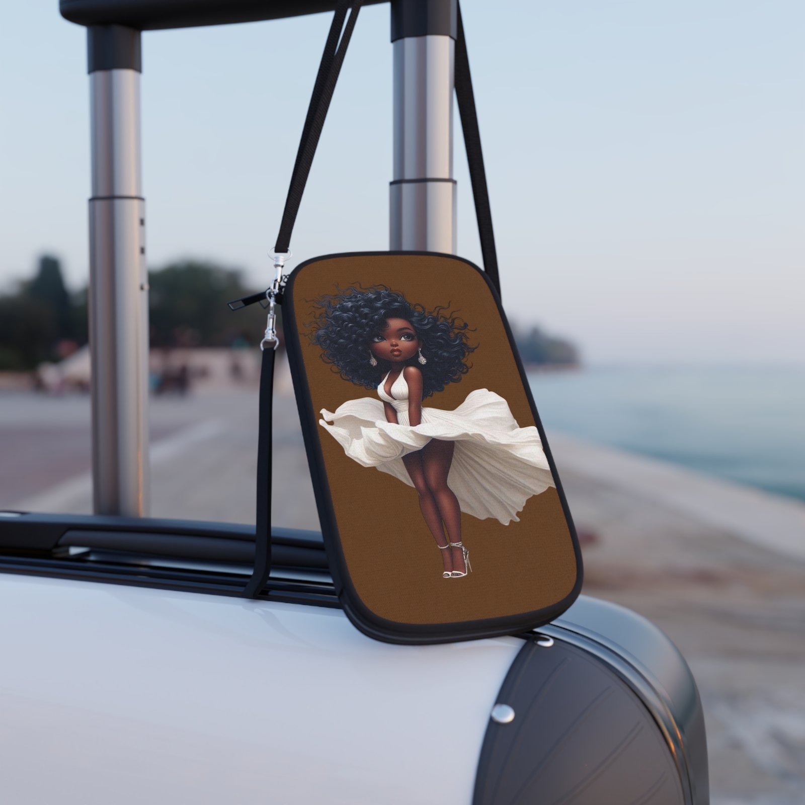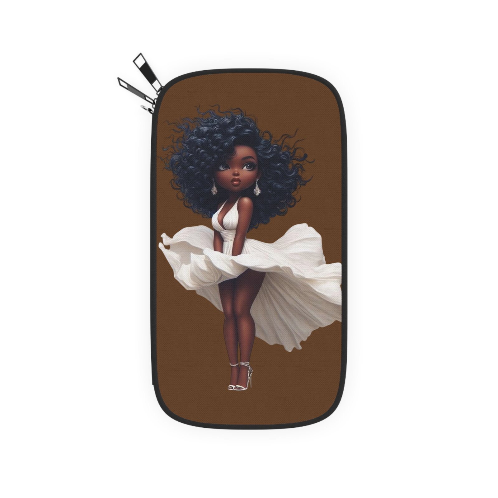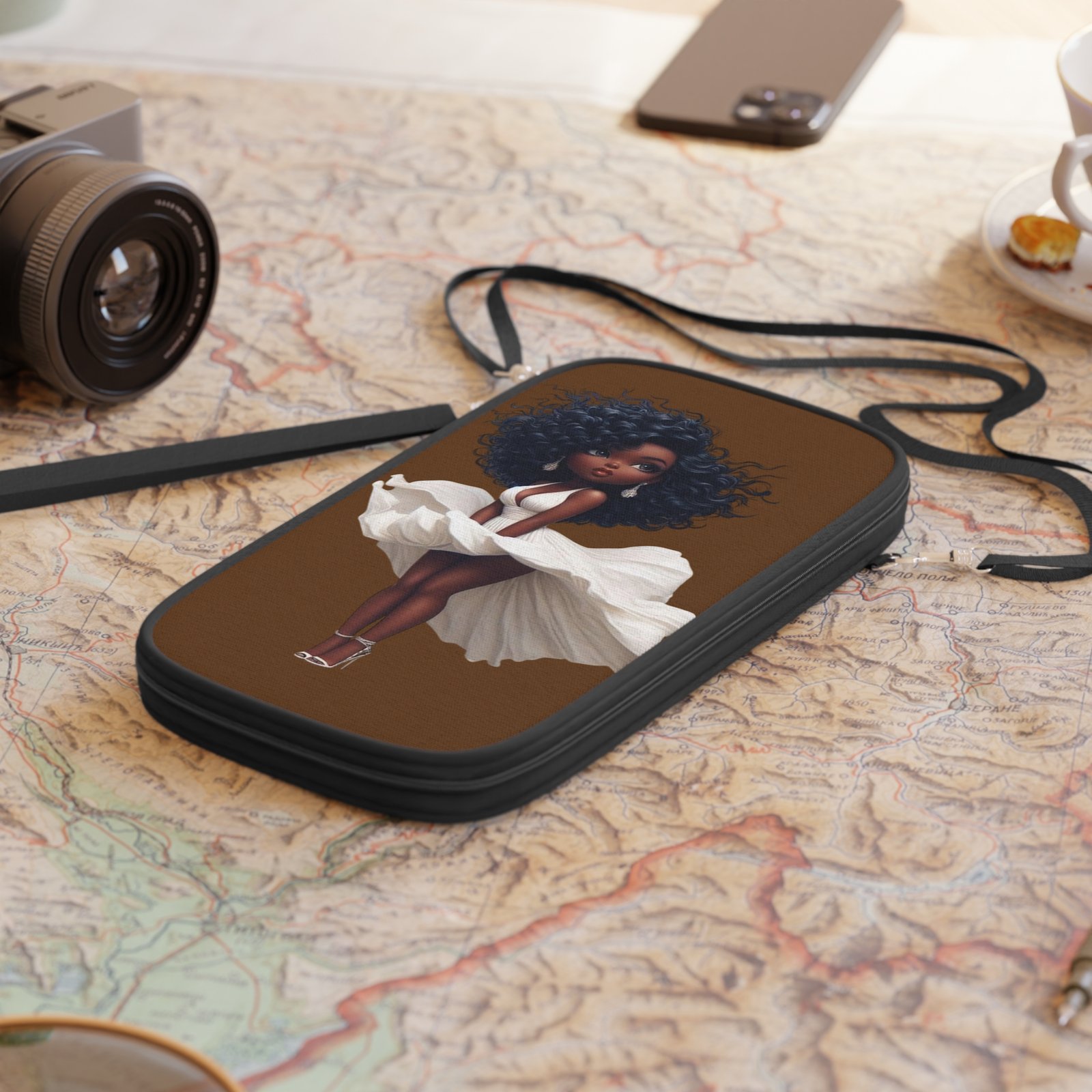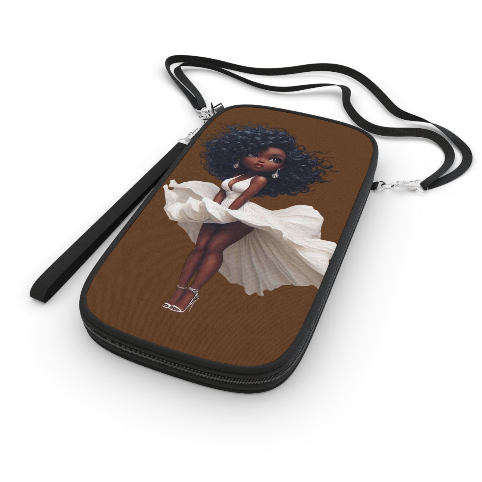 This passport wallet brings joyful style to travel moments. Soft, lightweight canvas holds a single bold print of a confident, curly-haired girl in a flowing white dress — warm browns and crisp whites that pop with high-resolution color. It opens to reveal organized dual-side compartments for passport, cash, cards and coins, plus a slim back pocket for quick access. The durable zipper and alloy hardware move smoothly, while the detachable shoulder strap and wrist strap make it easy to carry whether you’re filming a travel vlog, hopping a weekend flight, or slipping through museum lines. Compact and lightweight, it keeps essentials secure and ready without weighing you down.